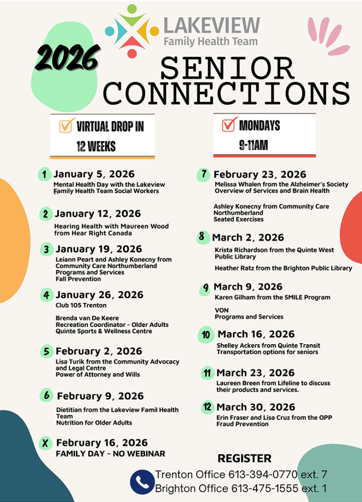 The Lakeview Family Health Team’s “Senior Connections” webinar series is offered each year starting in January. Designed specifically for seniors and facilitated by compassionate social workers and local experts, this 12-week program is the perfect place to learn new things, and stay active in your community.